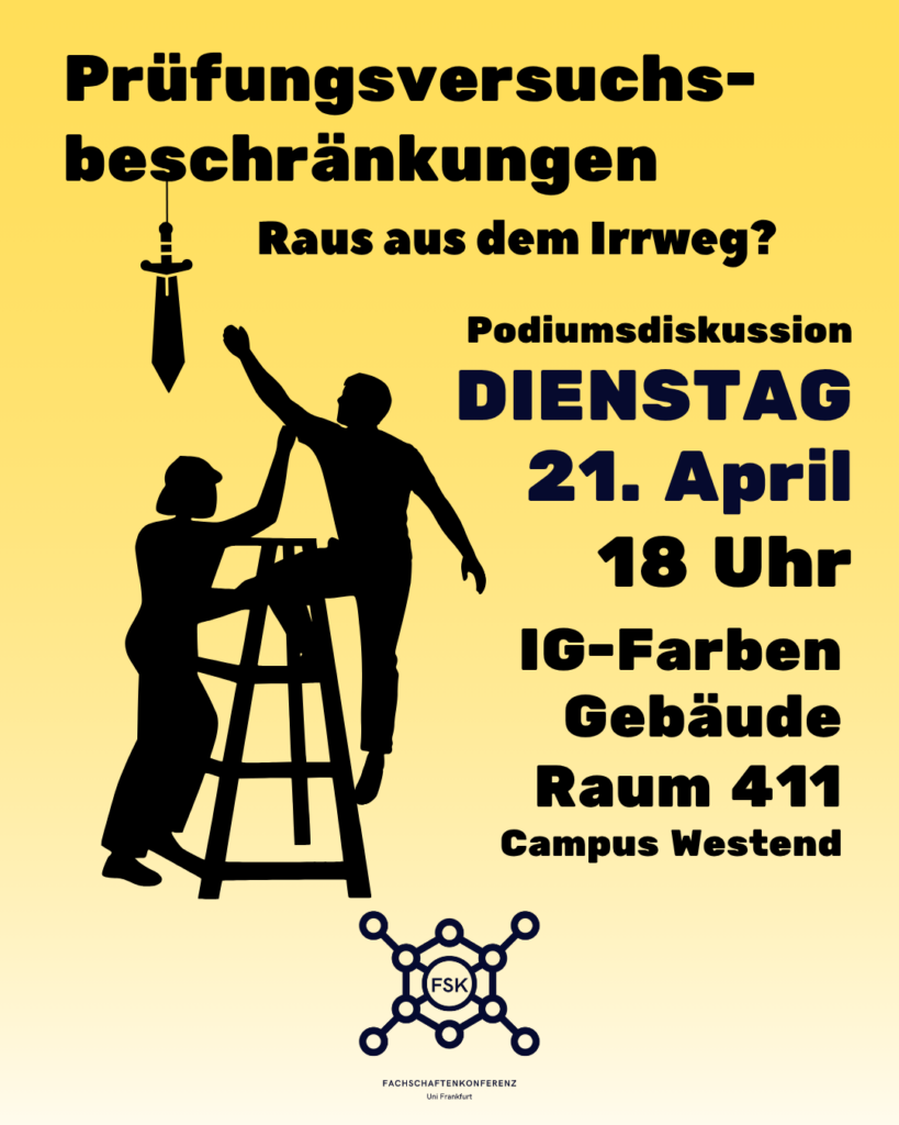 Auch an der Goethe-Uni herrscht eine Beschränkung der Prüfungsversuche. Sie ist festgeschrieben in der Rahmenordnung, welche aktuell erneuert wird. Ein hervorragender Zeitpunkt also, über ihre grundsätzliche Sinnhaftigkeit zu sprechen. Denn offensichtlich trägt sie weder hier noch an anderen Hochschulen mit ähnlichen Regelungen zu geringerer Prüfungsangst oder zur Lösung von Finanz- und Mental-Health-Problemen bei.